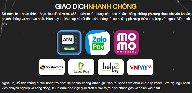 Rút tiền qua ví điện tử tại 888b năm 2025 đang ngày càng phổ biến nhờ tốc độ nhanh chóng và tiện lợi. Các ví điện tử như Momo, ZaloPay hay AirPay… được tích hợp vào hệ thống 888b, giúp người chơi rút tiền nhanh chóng, chỉ trong vòng vài phút đến vài giờ. Ưu điểm này rất hấp dẫn đối với những người chơi cần tiền mặt gấp. Tuy nhiên, nhược điểm là mức độ bảo mật có thể thấp hơn so với rút tiền qua ngân hàng nếu người dùng không bảo mật tốt thông tin tài khoản ví điện tử của mình. Ngoài ra, một số ví điện tử có thể có phí giao dịch nhỏ.